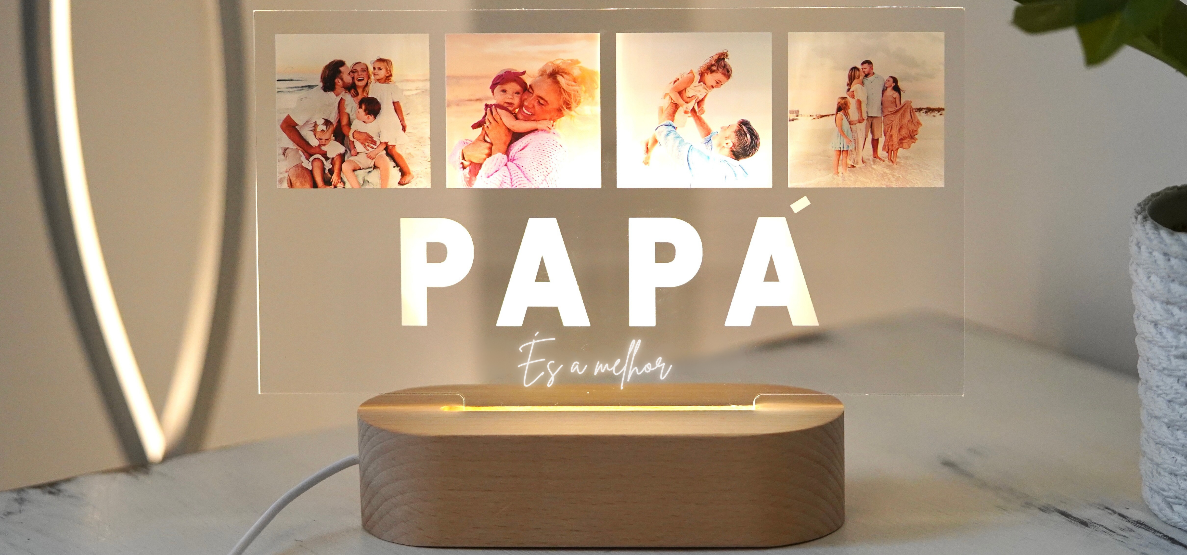 Na nossa loja, especializamo-nos em oferecer detalhes originais que irão surpreender o teu pai. Desde lâmpadas personalizadas até uma grande variedade de produtos como placas, capas de telemóvel, canecas, tote bags, porta-chaves, mealheiros, molduras, etc.