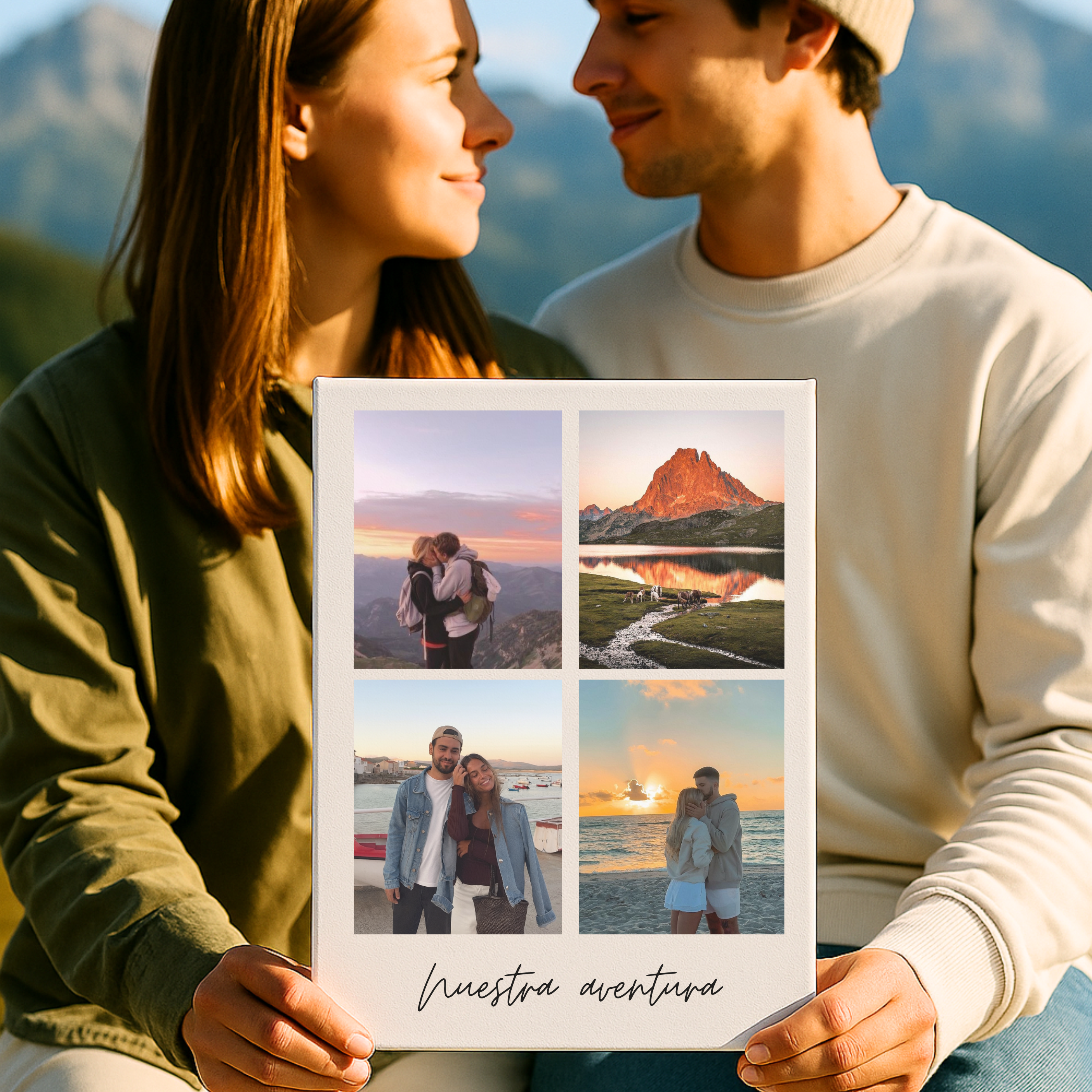 Convierte tus recuerdos en arte con este lienzo personalizado con dos fotos. Un regalo único que representa los momentos más especiales de tu historia: viajes, citas, pedidas o cualquier etapa significativa de tu relación. Cada foto será el recuerdo de vuestros lugares, anécdotas y momentos juntos.